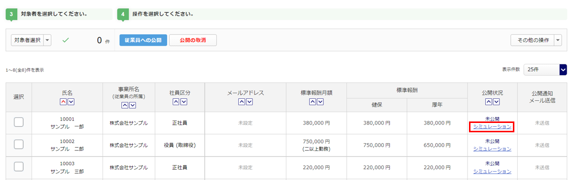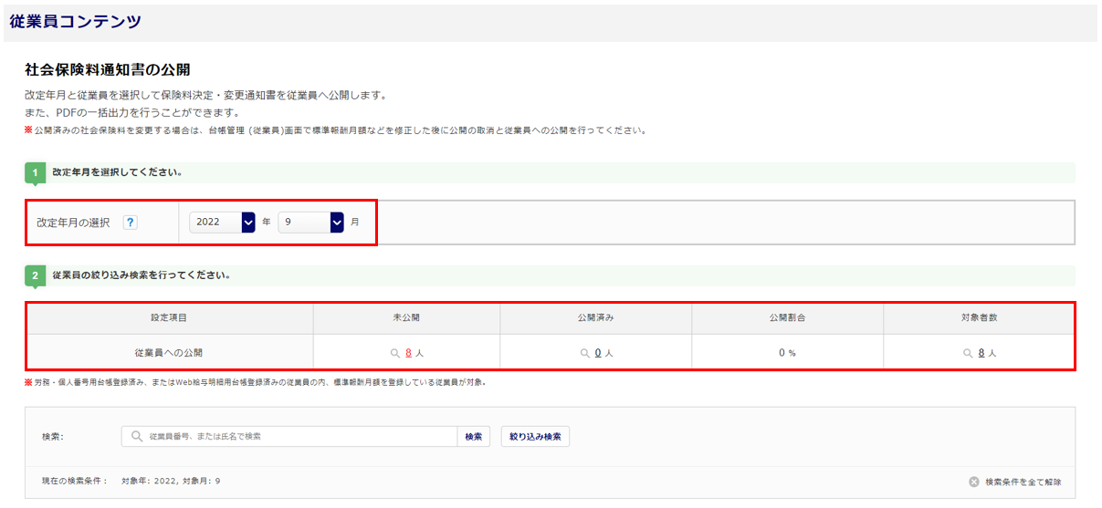 選択した「改定年月」と、従業員台帳の以下のいずれかの「改定年月」が一致した従業員への公開状況が表示されます。