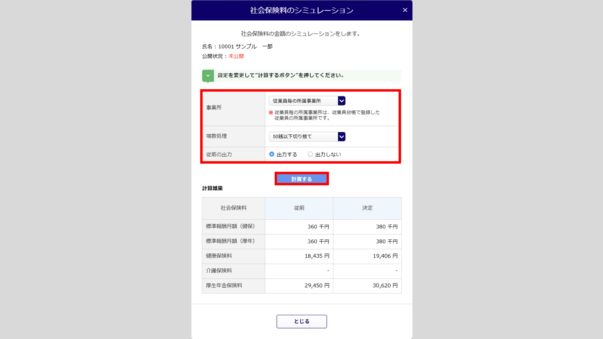 設定を変更し、[計算する]をクリックし、計算結果を確認します。