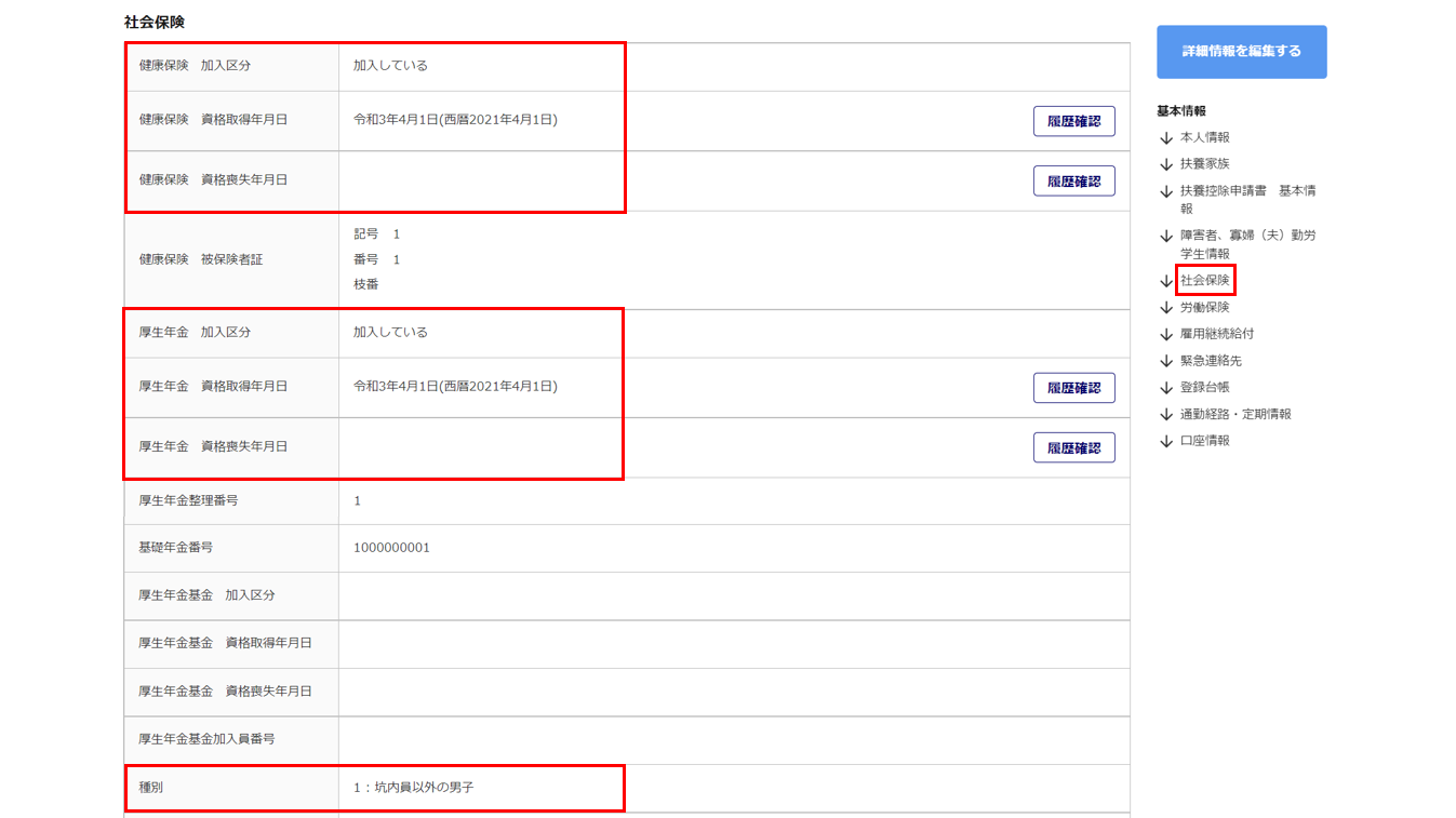※社会保険に加入か否かの判定には、「台帳管理」社会保険欄の「取得年月日」と「資格喪失日」の情報