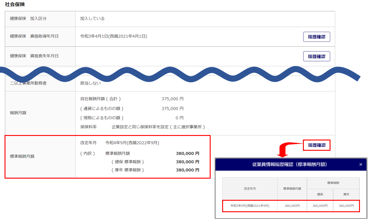 従前の金額が表示されない場合、「台帳管理」から対象従業員の「従業員詳細」画面にて、以下の内容を確認します。