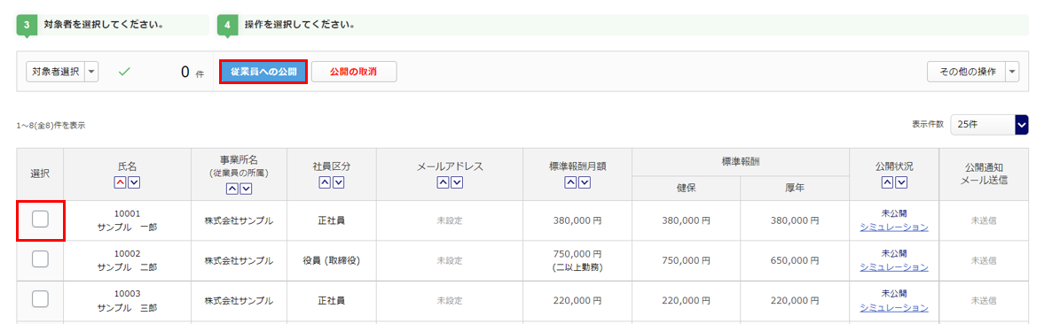 社会保険料決定・変更通知書を公開する従業員を選択し、[従業員への公開]をクリックします。