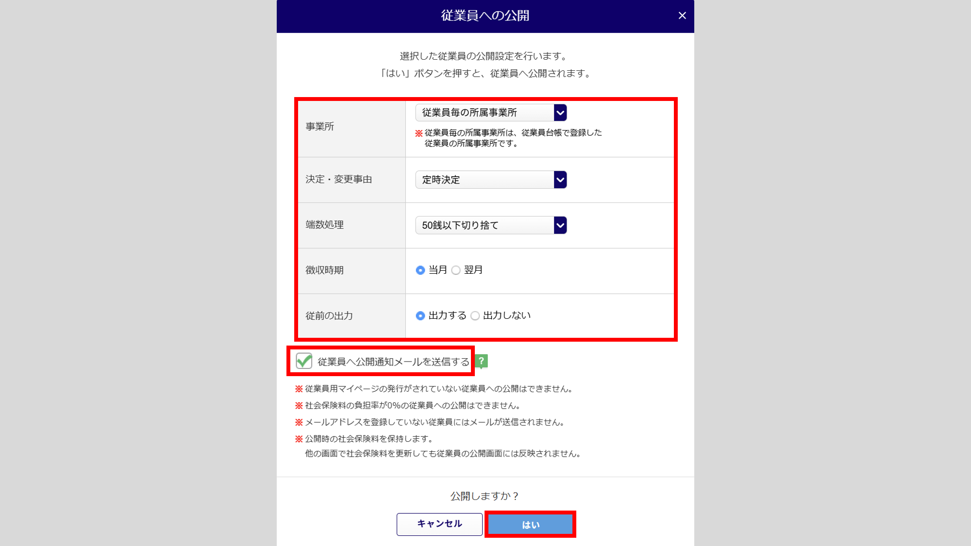 公開内容を設定します。設定後、[はい]をクリックします。