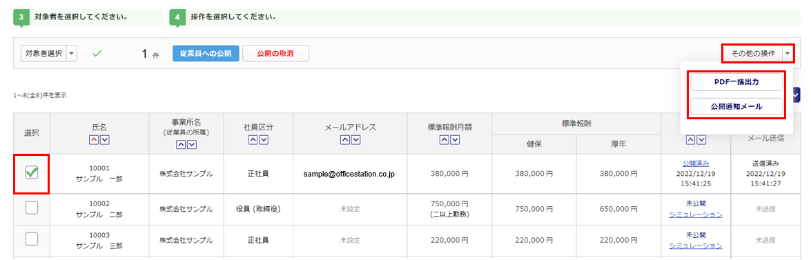 対象従業員を選択し、[その他の操作]をクリックすると、PDFの一括出力および、公開通知メールの手動配信をおこなうことができます。