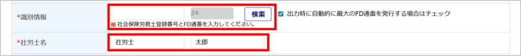 「識別情報」は、「社労士登録番号」と「FD通番」の組み合わせになります。