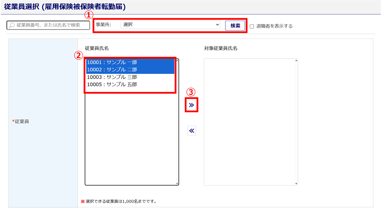 対象従業員を選択(➁)し、[≫](③)をクリックします。