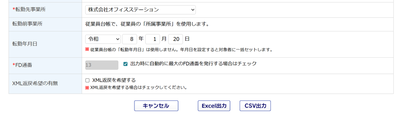 | 転勤年月日 | Excelファイル出力時、「転勤年月日」を入力した日付が反映されています。 個別で日付を指定する場合は、入力してください。 |