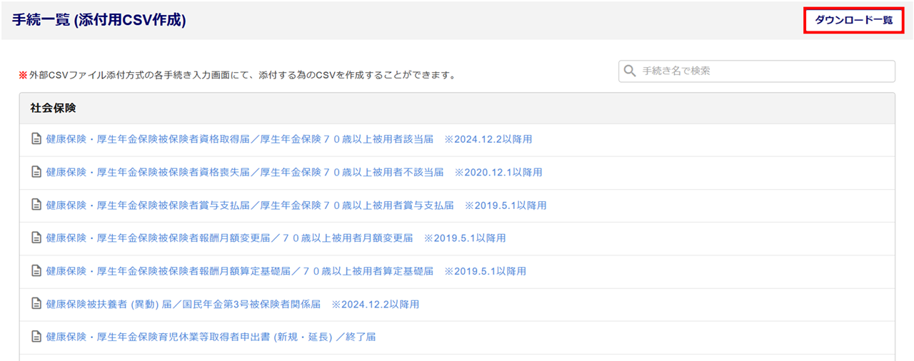 該当画面を閉じてしまった場合は、[帳票]>[電子申請 添付用CSV作成]をクリックし、「手続一覧 (添付用CSV作成)」画面の[ダウンロード一覧]をクリックします。