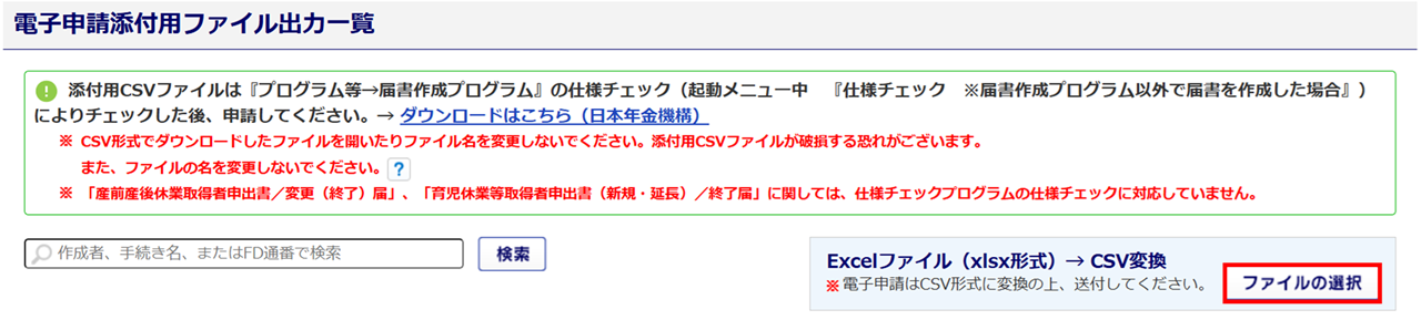 「電子申請添付用ファイル出力一覧」画面を表示します。