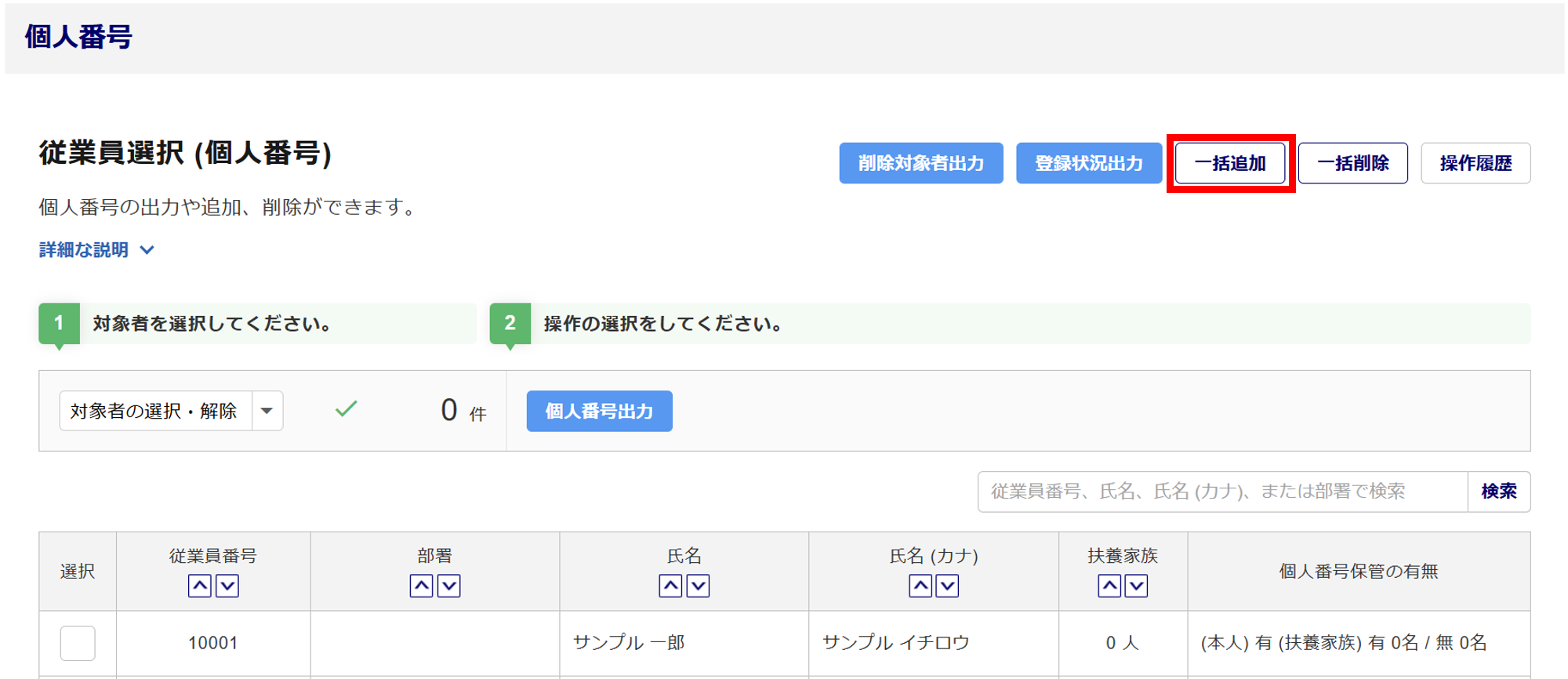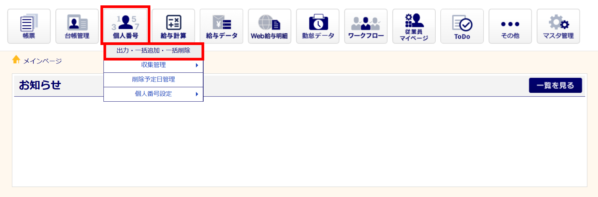 [個人番号]>[出力・一括追加・一括削除]をクリックします。