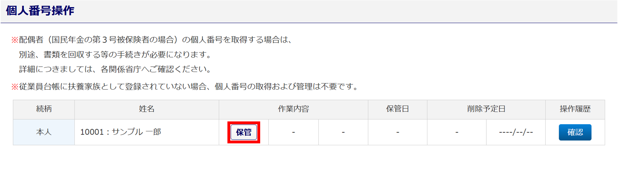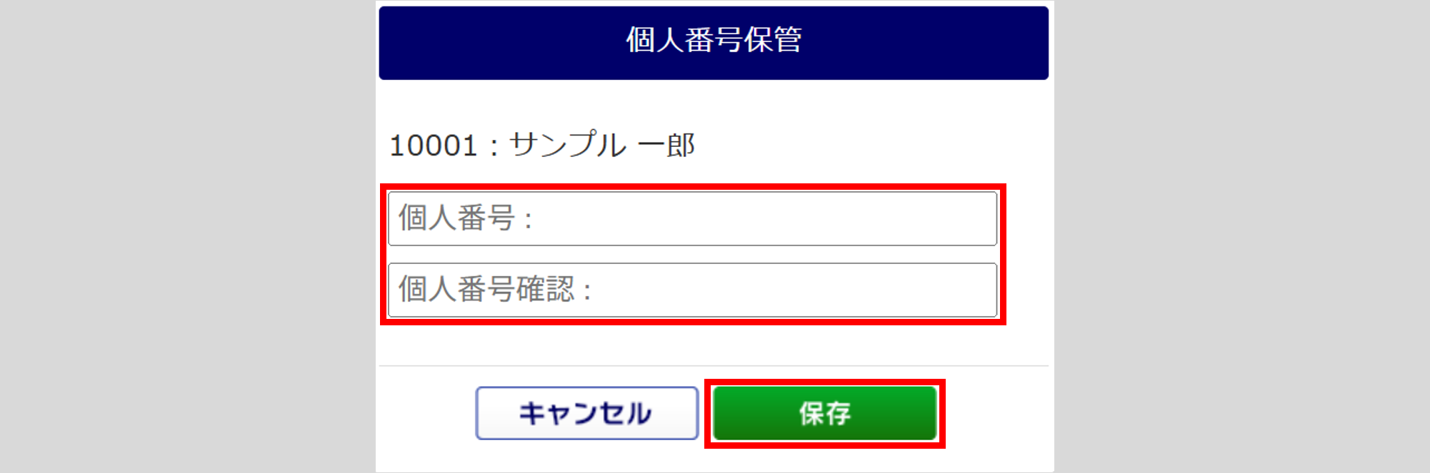 「個人番号」と「個人番号確認」に個人番号(マイナンバー)を入力し、[保存]をクリックします。