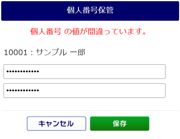 「個人番号の値が間違っています。」と表示される場合、入力した個人番号に誤りがあります。