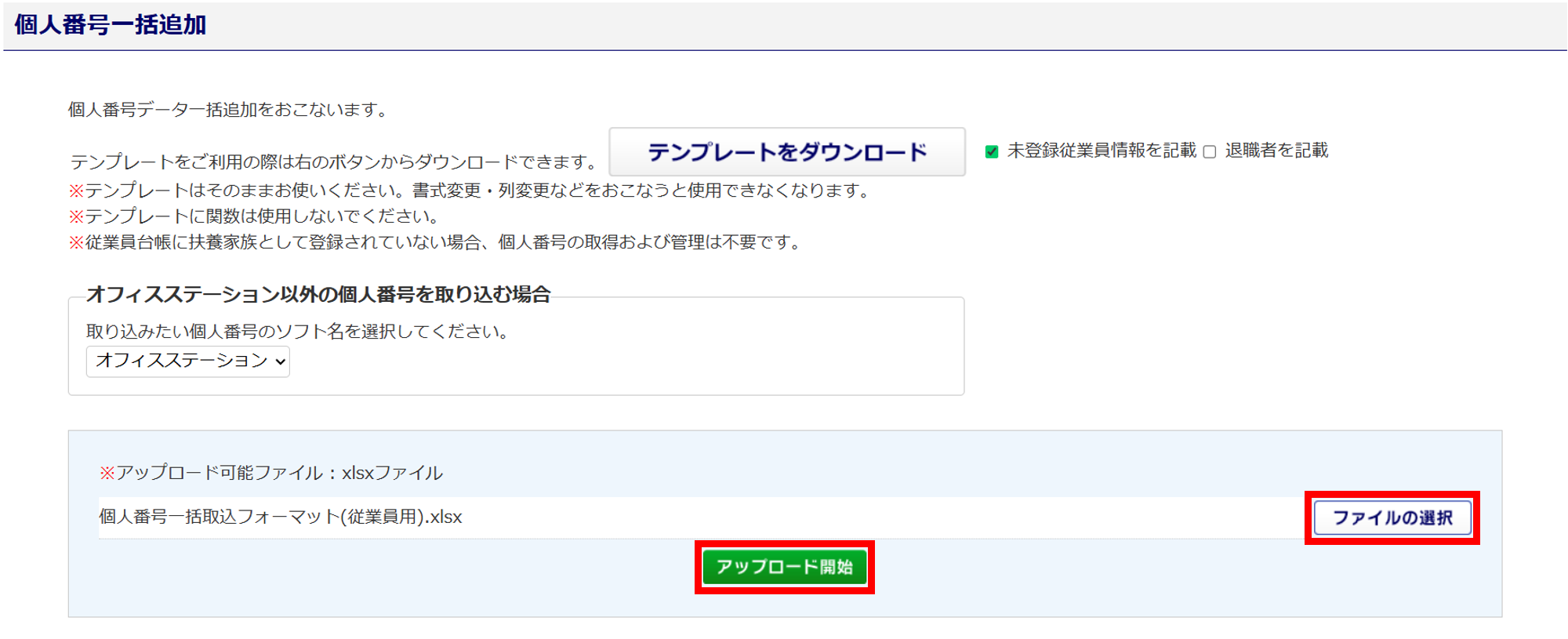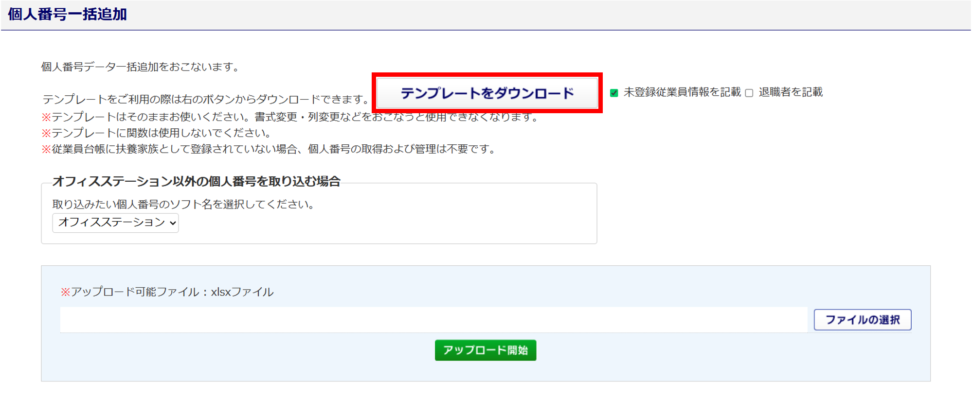 退職者の個人番号(マイナンバー)も一括で登録をおこなう場合は、「退職者を記載」にチェックします。