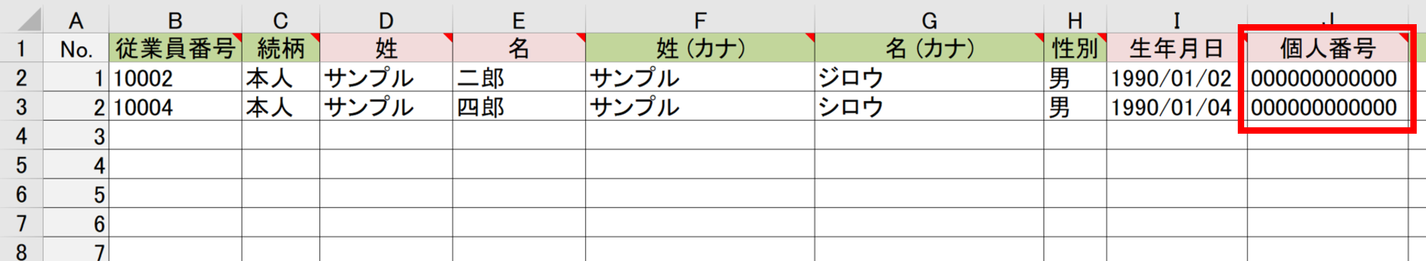 テンプレートに記載されている従業員および扶養家族は、J列「個人番号」を必ず入力してください。