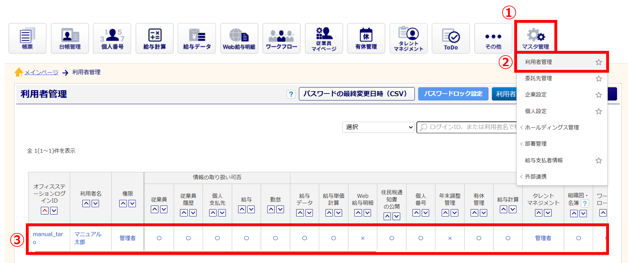 [マスタ管理](①)>[利用者管理](②)> 認証方法を切り替える利用者(③)をクリックします。