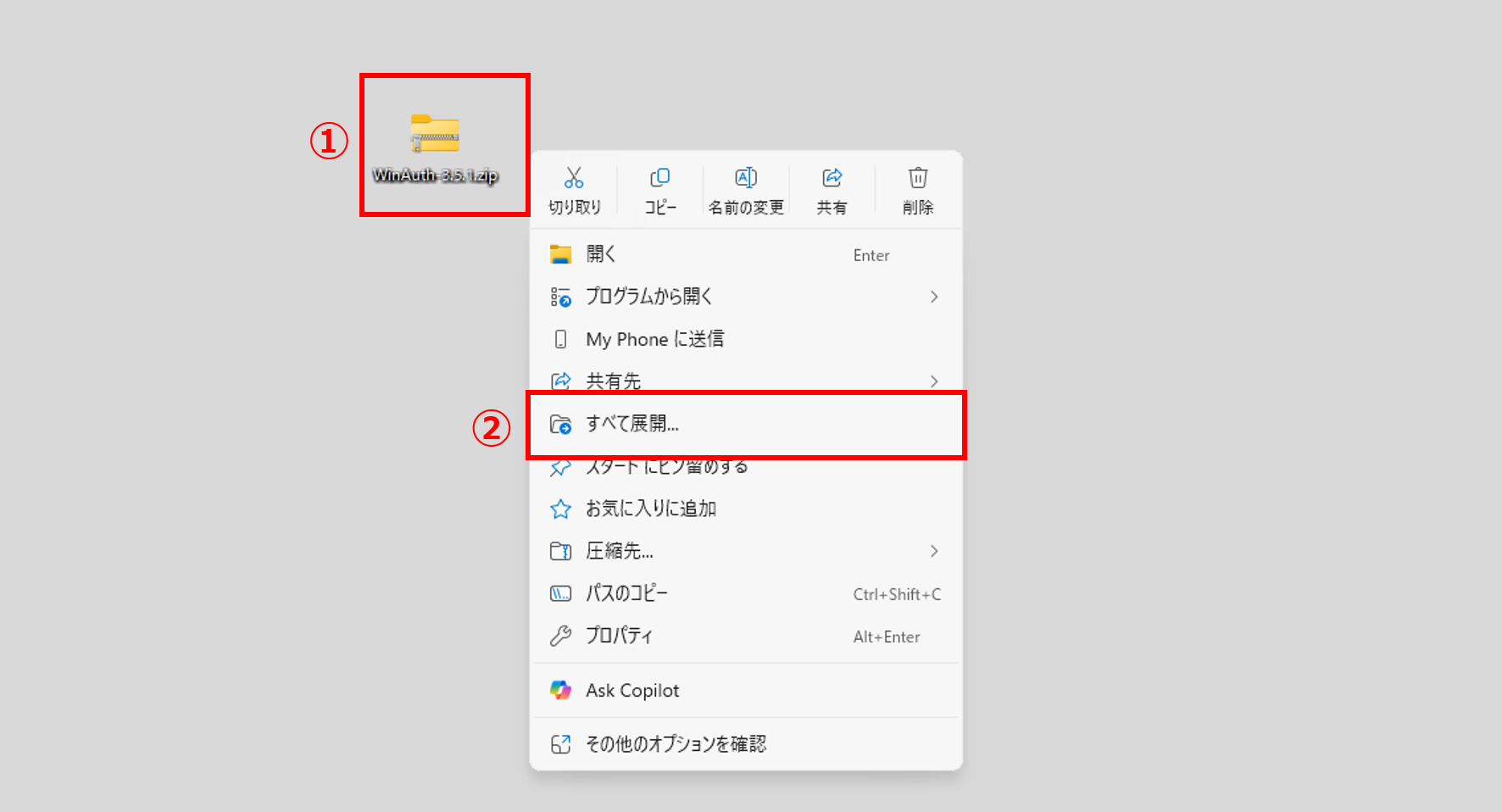 ダウンロードしたZIPファイル(①)を選択後、右クリックし、[すべて展開](➁)をクリックします。