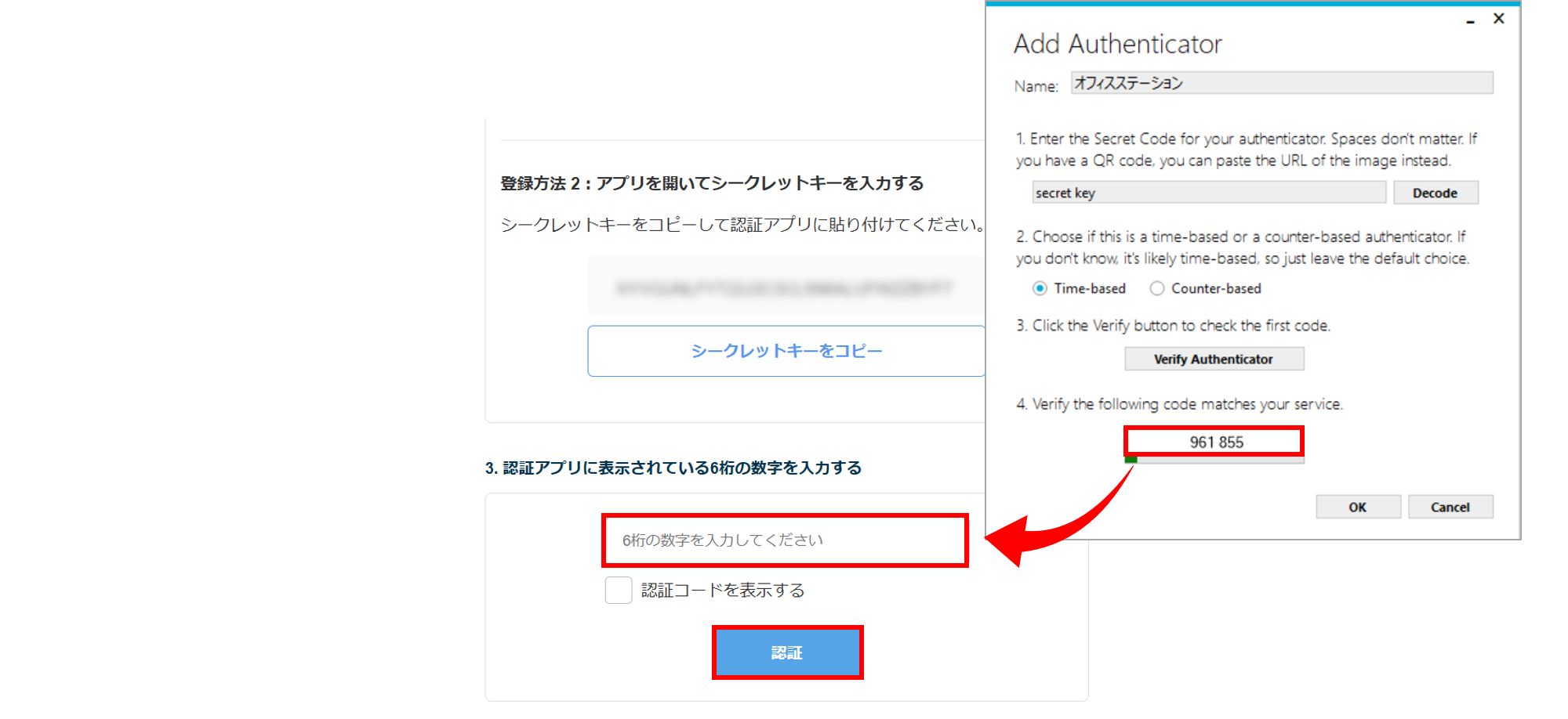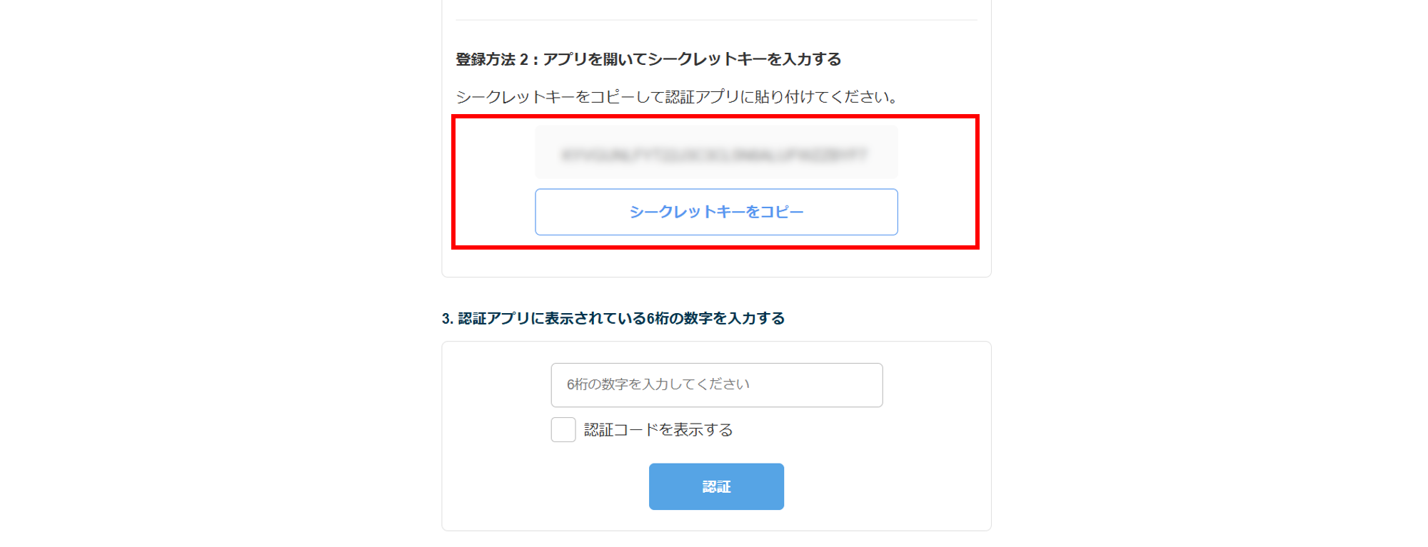 「2.認証アプリにオフィスステーションを登録する」に表記されている「シークレットキー」をコピーします。