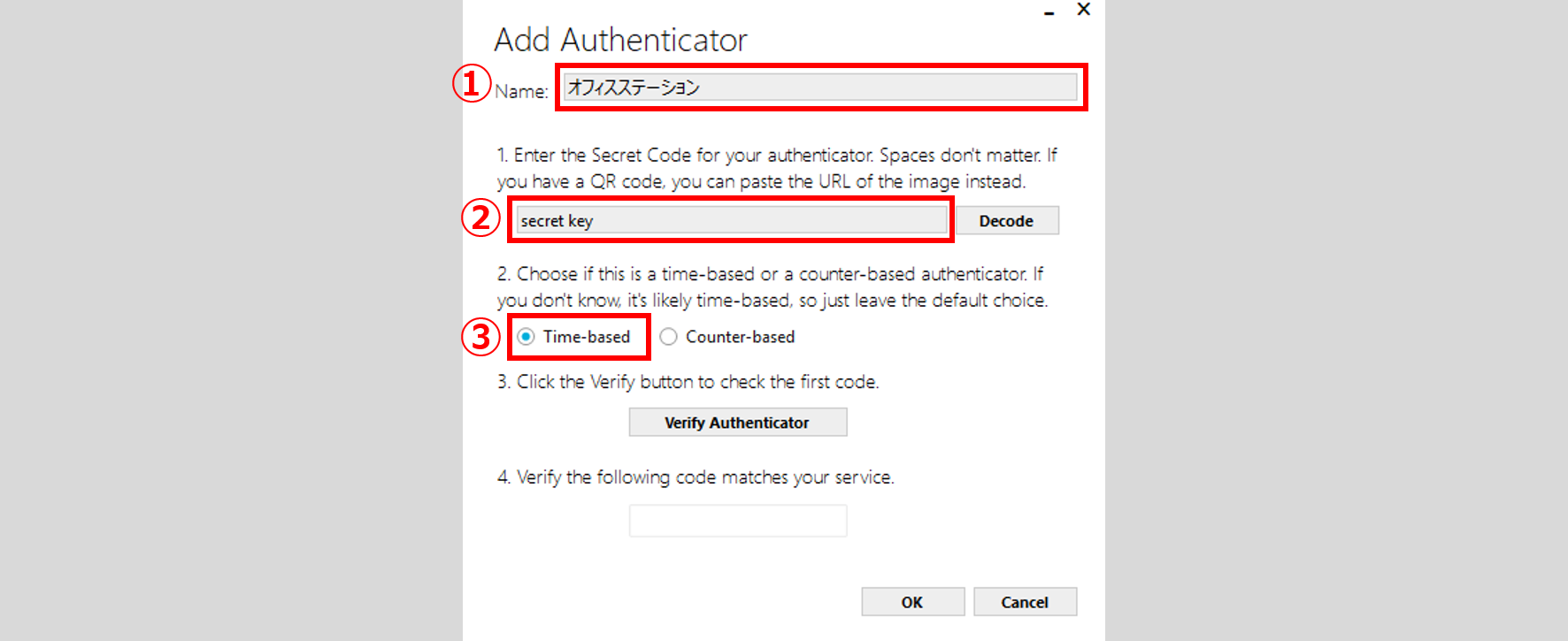 Win Auth起動時に表示する名称を「Name」(①)に入力し、コピーした「シークレットキー」を②に貼り付けます。