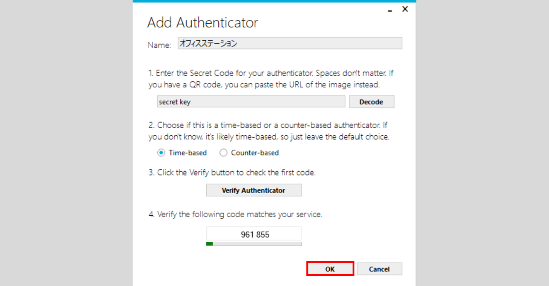 「Add Authenticatior」画面に戻り[OK]をクリックします。