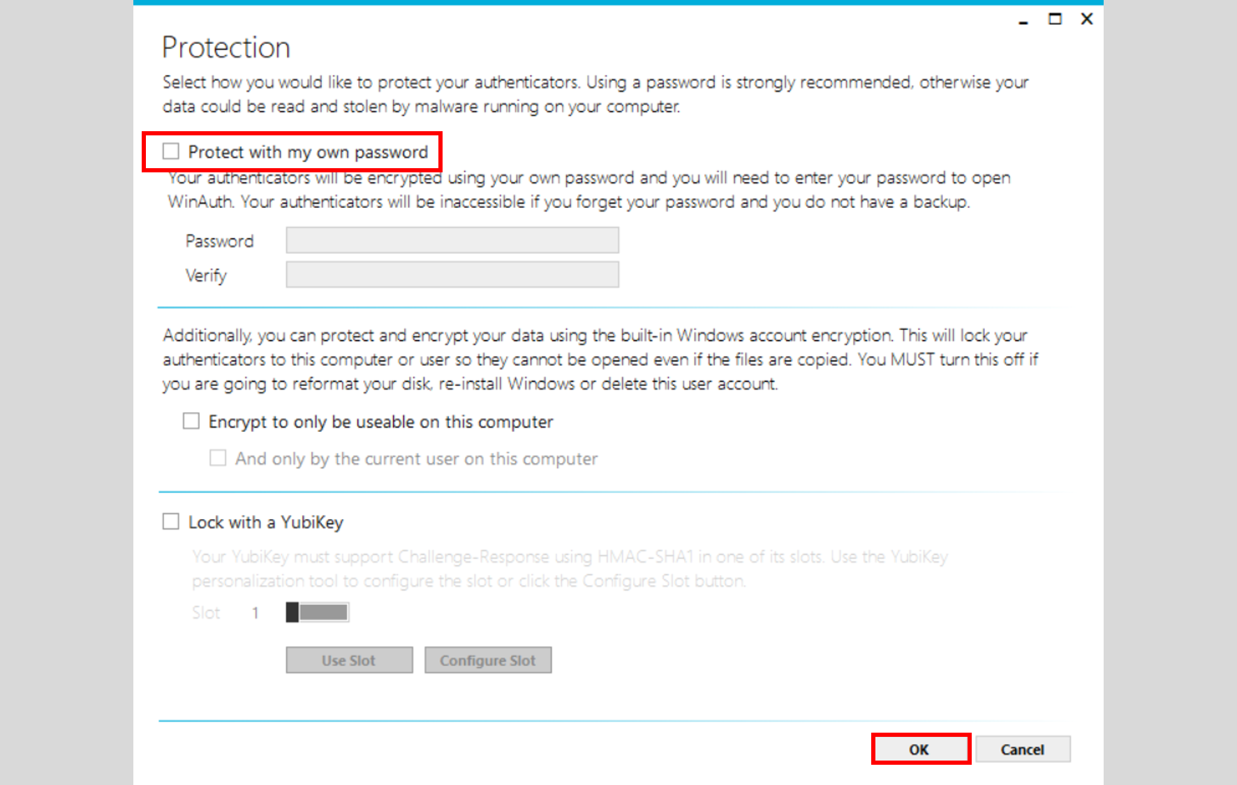 「Protect with m own password」のチェックを外し、[OK]をクリックします。