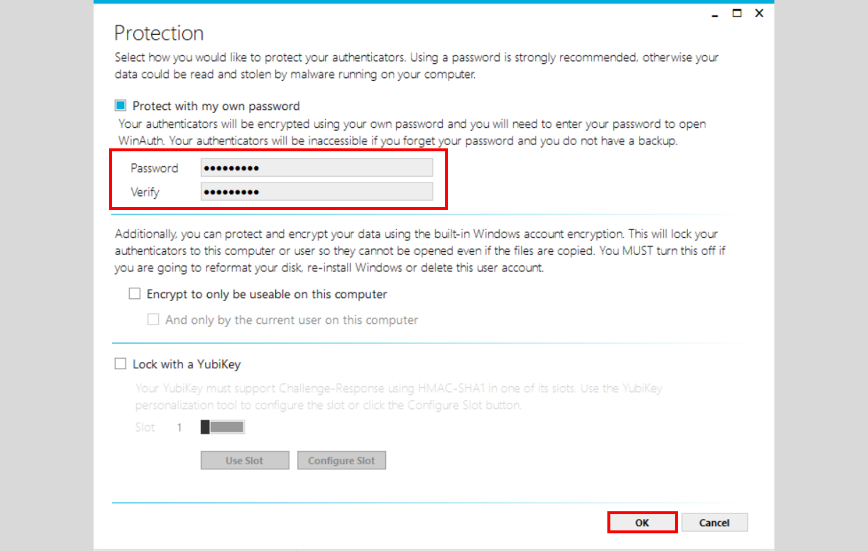 「Password」「Verify」にパスワードを2回入力し、[OK]をクリックします。