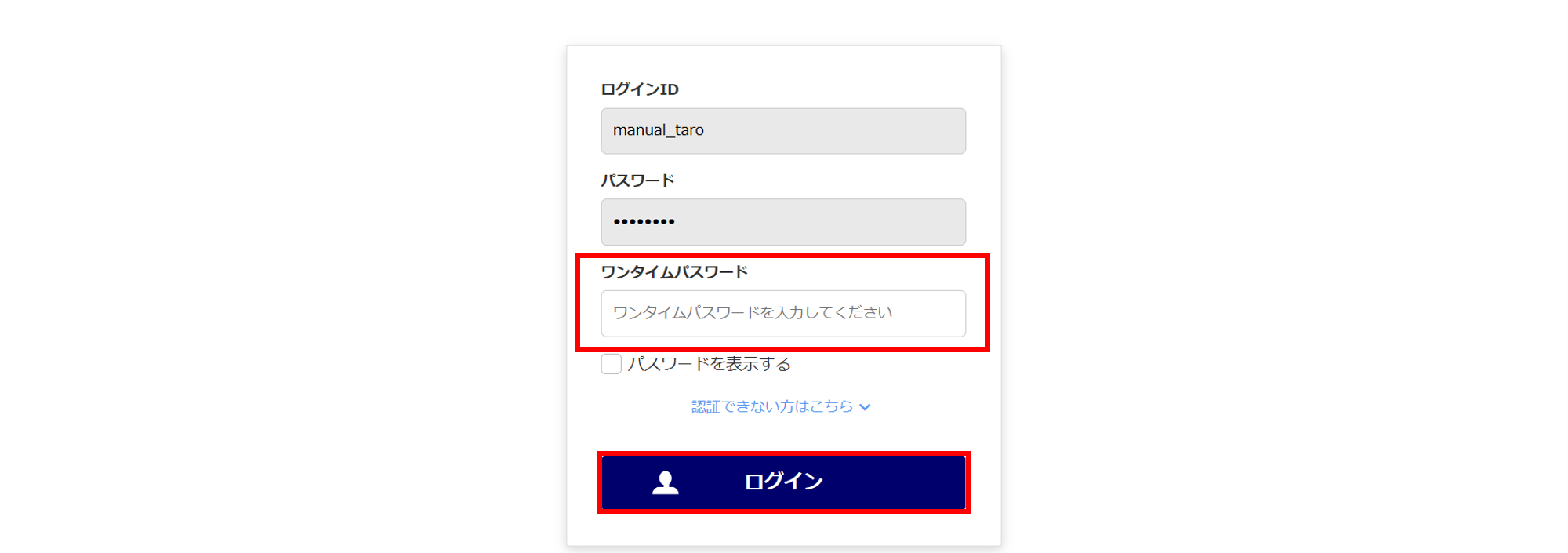 「ログインID」「パスワード」の他に、6桁の「ワンタイムパスワード」を入力し、[ログイン]をクリックします。