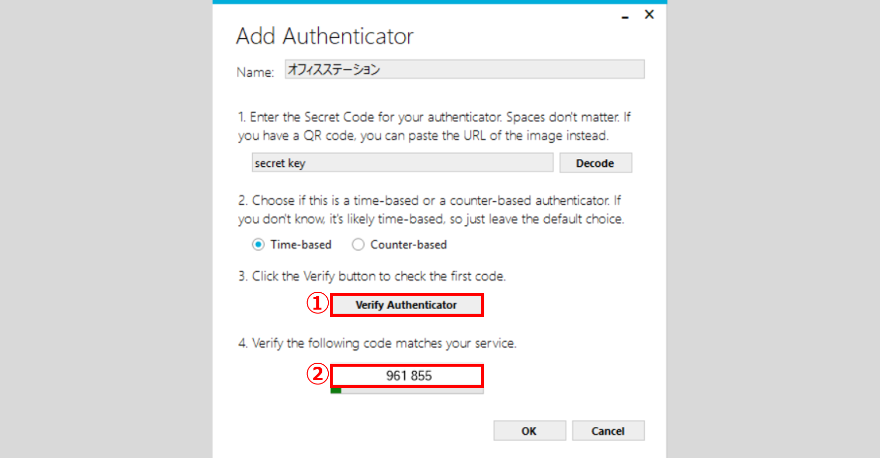 [Verify Authenticatior](①)をクリックすると、「➁」に数字が表示されます。