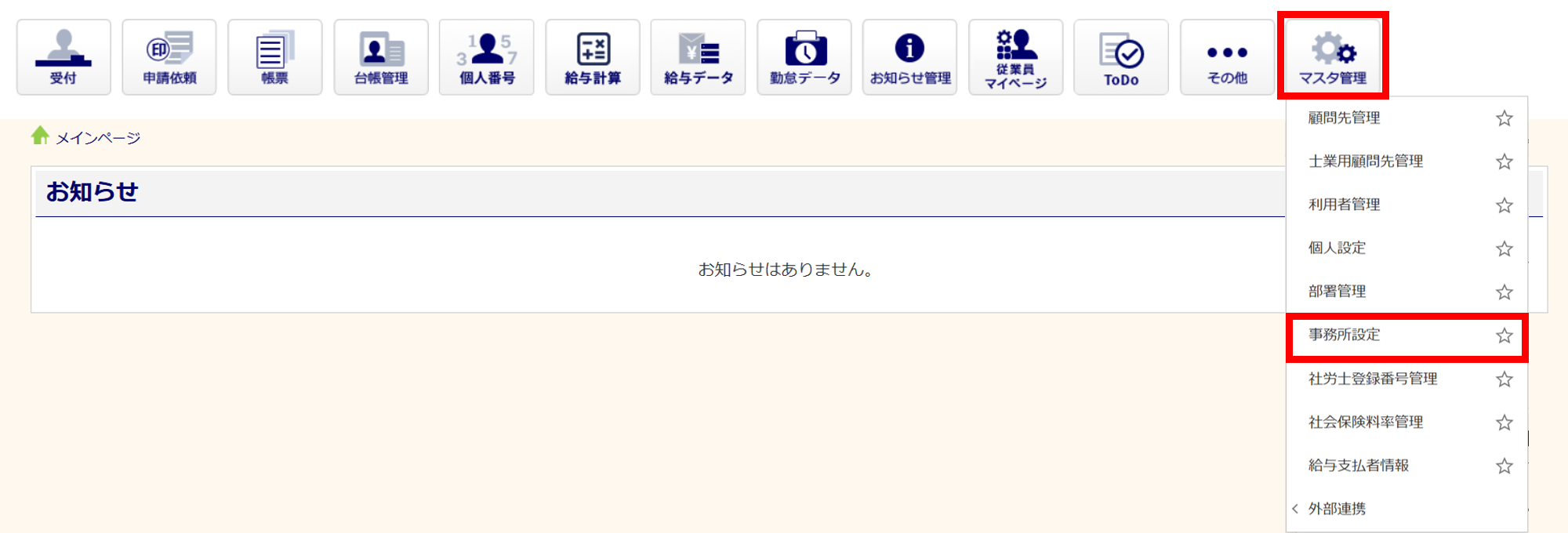 [マスタ管理]>[事務所設定]をクリックします。