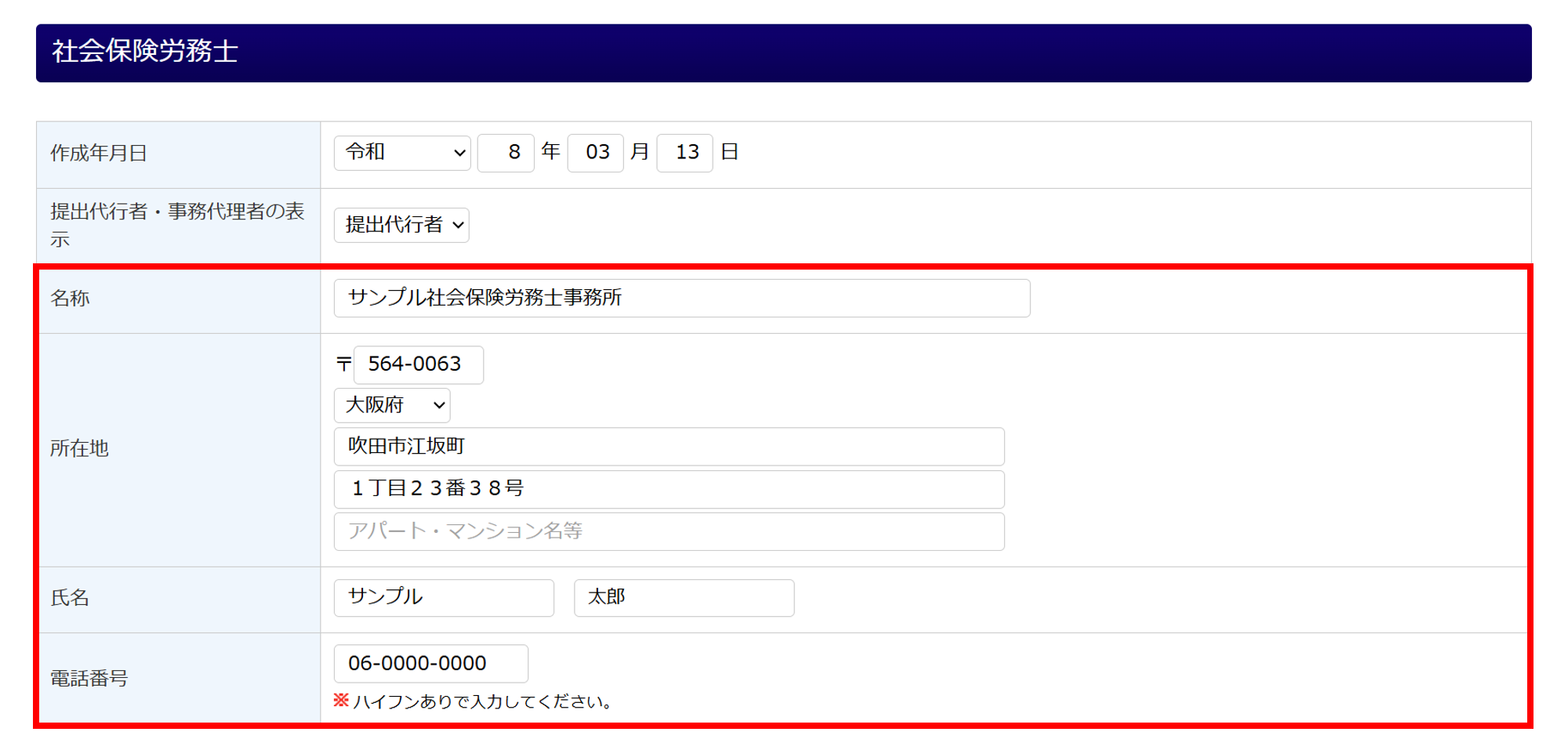 ※帳票によって「社会保険労務士」欄の入力項目が異なります。