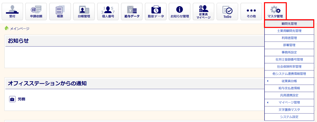 [マスタ管理]>[顧問先管理]をクリックします。