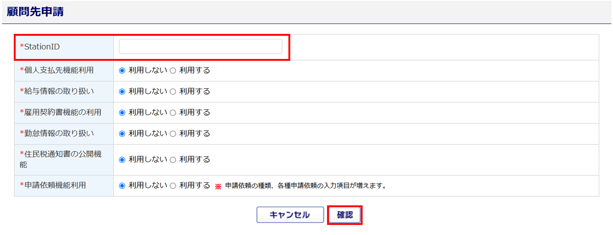 「申請依頼機能利用」に「利用する」を選択すると、入力項目が増えます。