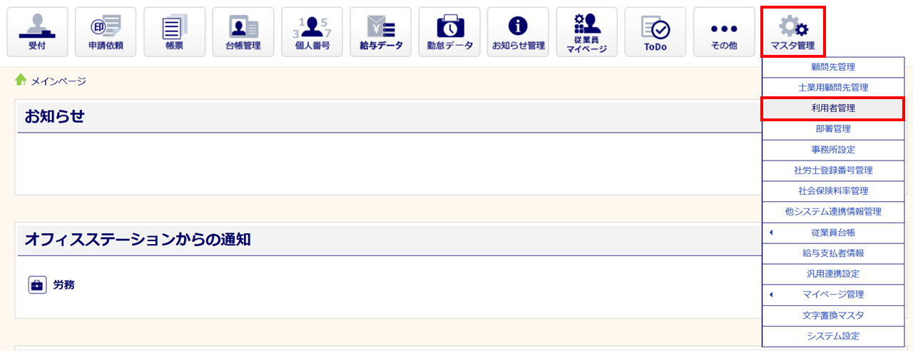 [マスタ管理]>[利用者管理]をクリックします。