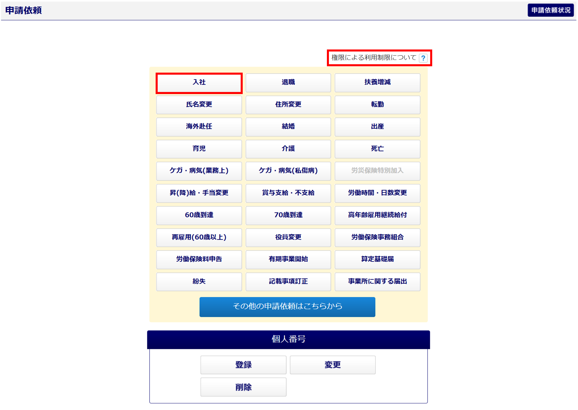 画面に表示される申請依頼の種類は、利用者の権限によって異なります。