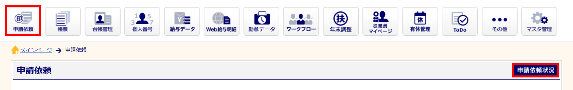 依頼した申請の受付状況を確認するには、[申請依頼]>[申請依頼状況]をクリックします。