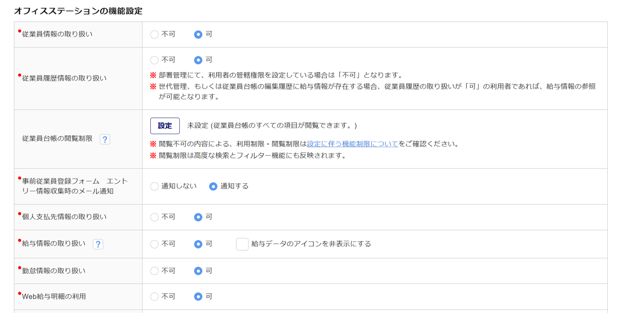 給与情報の取り扱い 従業員台帳の給与に関わる項目、給与データの取込、項目・給与データを使用する機能(帳票、申請依頼)の利用可否を設定します。