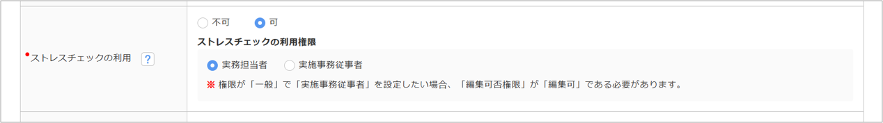 | ストレスチェックの利用 | 「オフィスステーション ストレスチェック」機能の利用可否を設定します。 「不可」を選択すると、メインページ[ストレスチェック]のアイコンが非表示となります。 実務担当者 実施計画の策定や実施の管理などの実務を担当します。 ただし、従業員から開示されていないストレスチェック結果は取り扱うことができません。 実施事務従事者 実施者(医師や保健師など)の指示に従い、面接指導の日程調整などのストレスチェックの実施に関する事務に携わります。 |