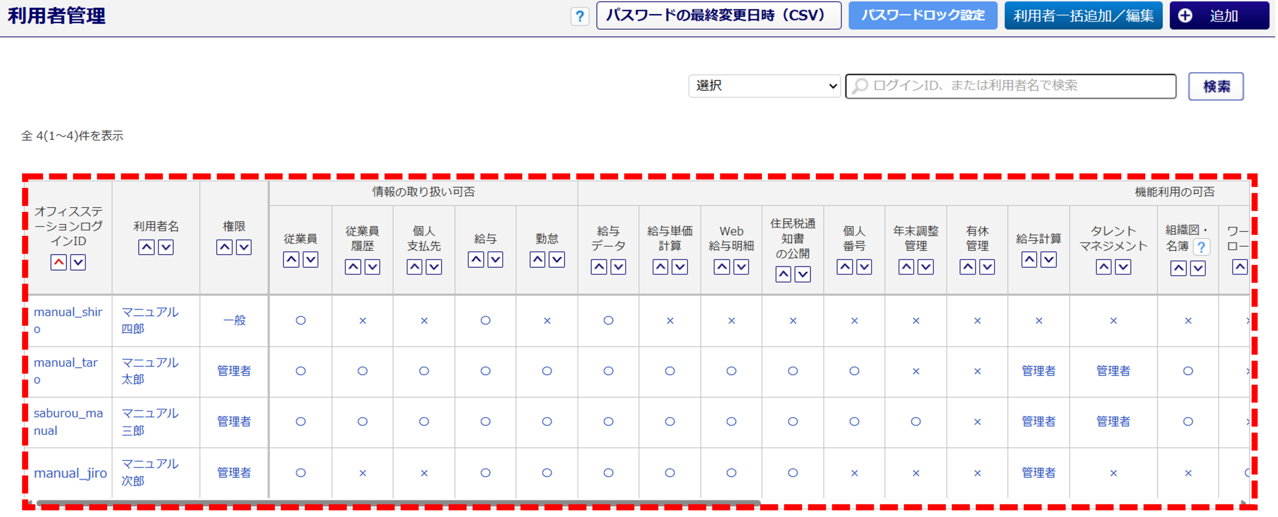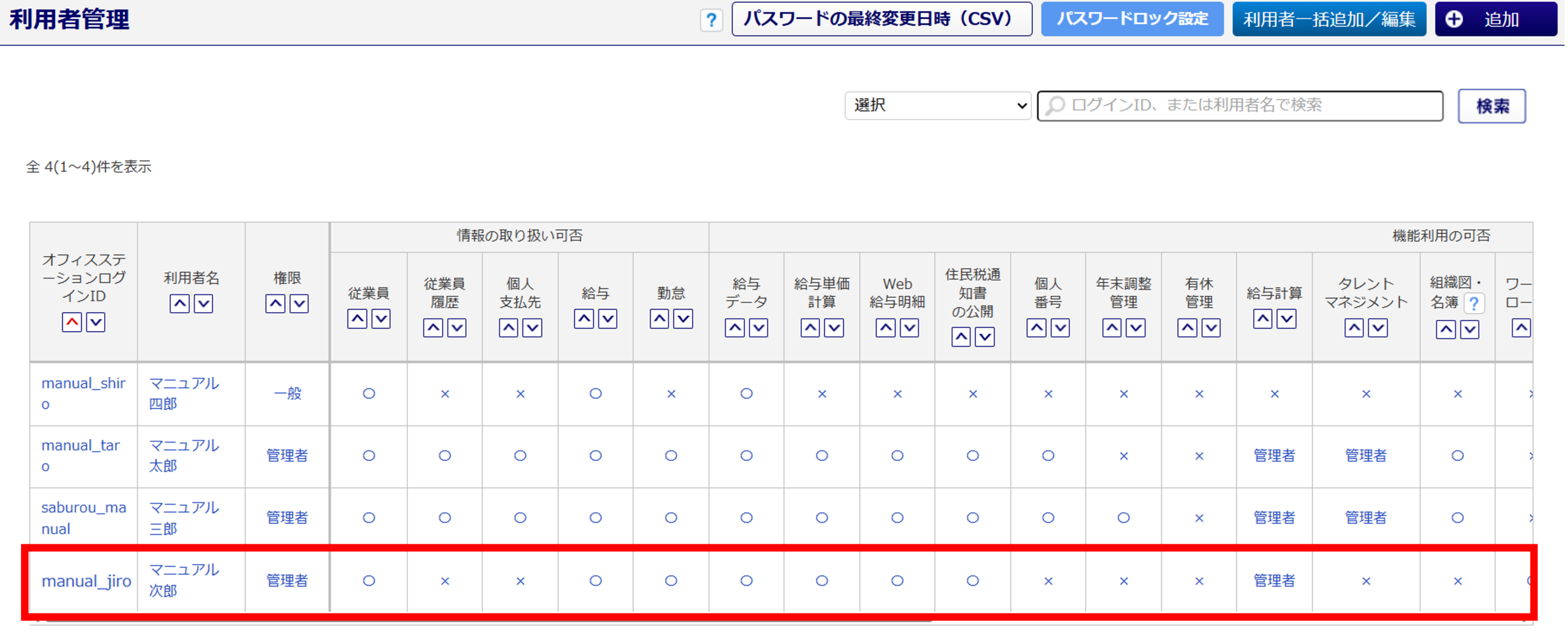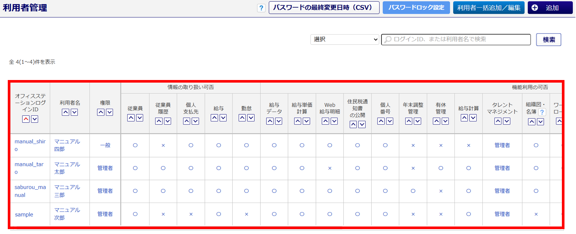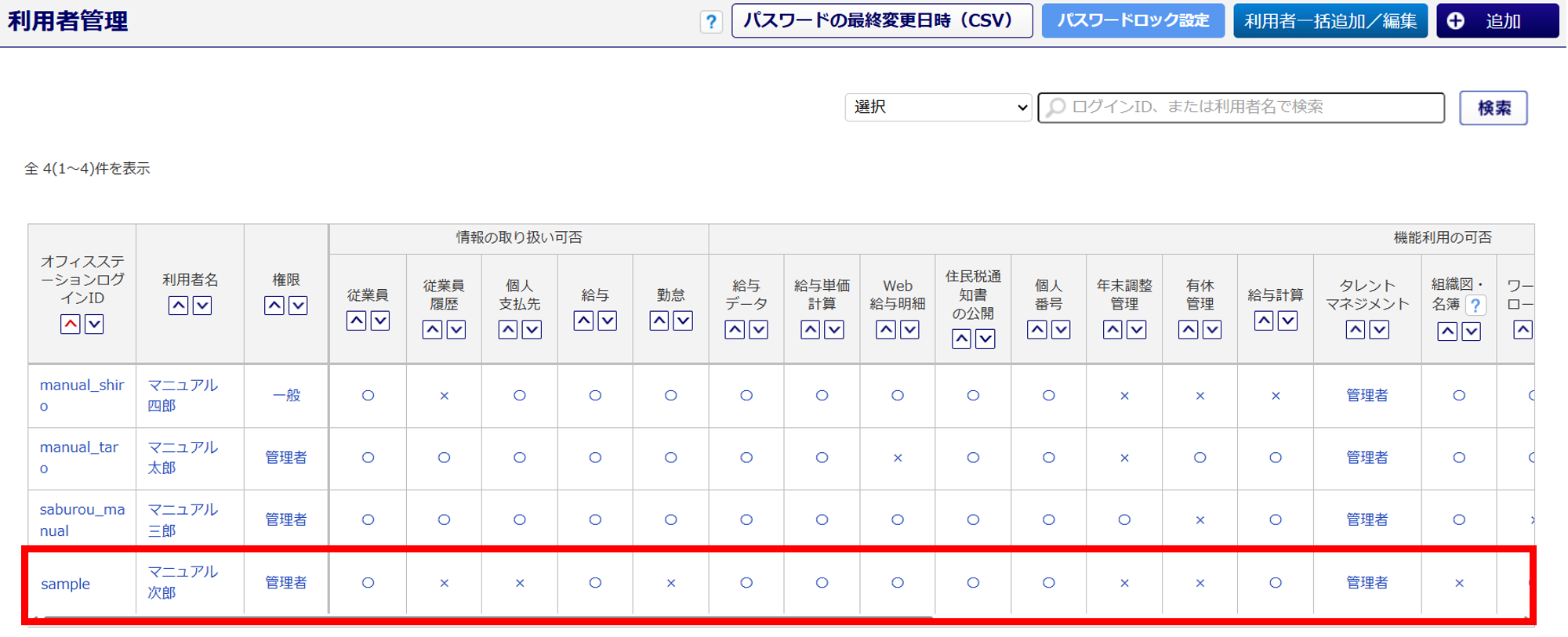 | 給与計算の利用 | 「オフィスステーション 給与」機能の利用可否を設定します。 「不可」を選択すると、[給与計算]のアイコンが非表示となります。 ※ユーザ情報の権限が「一般」の場合、「給与情報の取り扱い」が「可」かつ、「給与データの 利用」を「不可」と選択していると、「給与計算の利用」は「不可」となります。 「権限」について(企業版のみ) ・一般 「オフィスステーション 給与」の機能が制限されます 制限される機能の詳細については、[?(はてなマーク)]をクリックしてご確認ください。 ・管理者 「オフィスステーション 給与」の機能が全て利用できます。 |