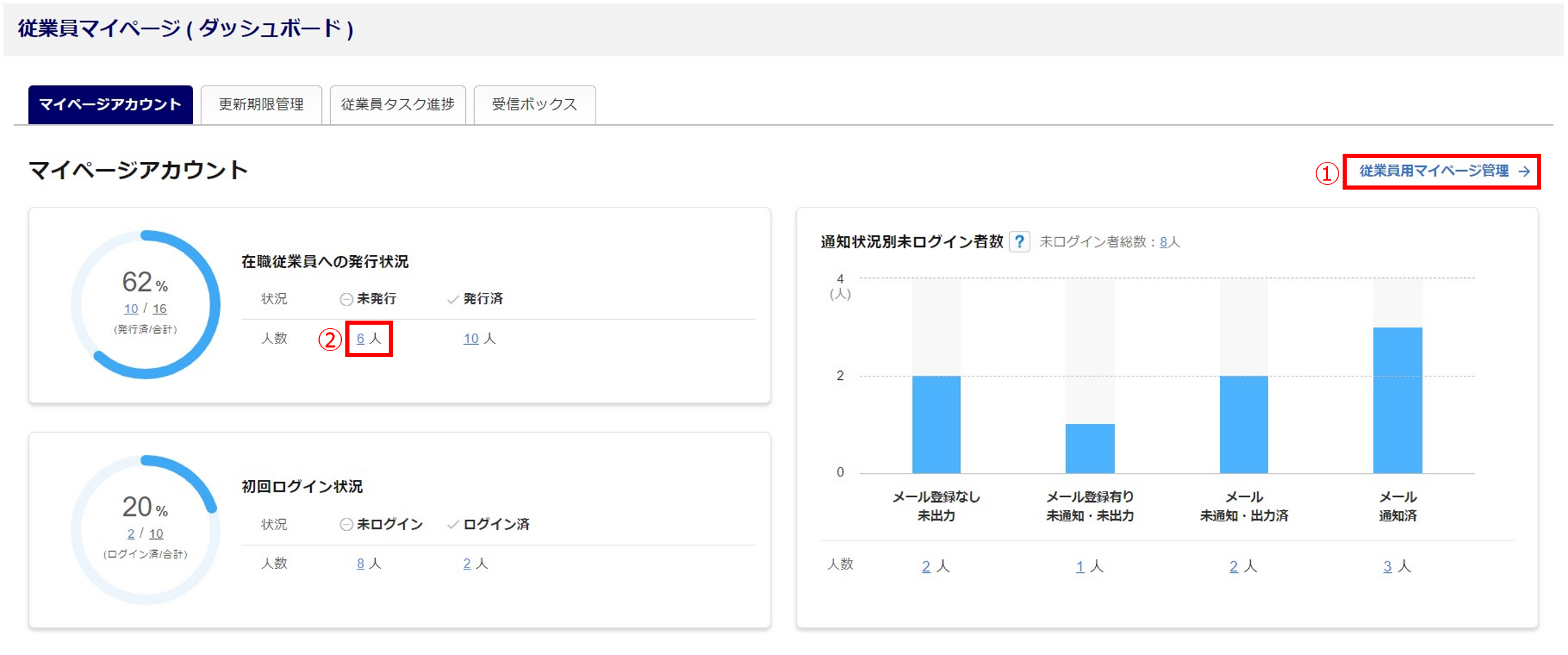 例)従業員マイページ発行済の従業員10人(合計)のうち、2人が従業員マイページに初回ログイン済です。