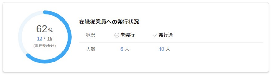 例)従業員台帳に登録のある在職従業員16人(合計)のうち、10人の従業員に対して従業員マイページを発行済です。