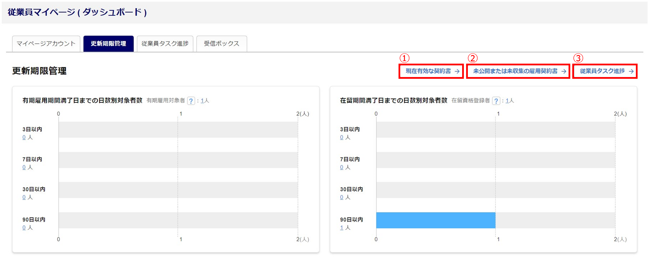 以下の利用者は「有期雇用期間満了日までの日数別対象者数」の確認ができません。 ※企業の場合のみ