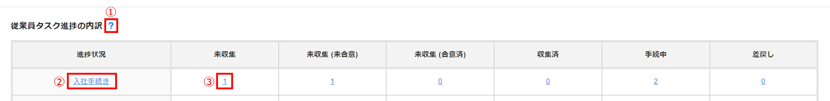 (はてなマーク)]()をクリックすると、「進捗状況」の各ステータスの詳細を確認でき、手続き名()や下線つきの数字()をクリックすると、該当の従業員が表示された状態の「従業員タスク進捗」画面が表示されます。
