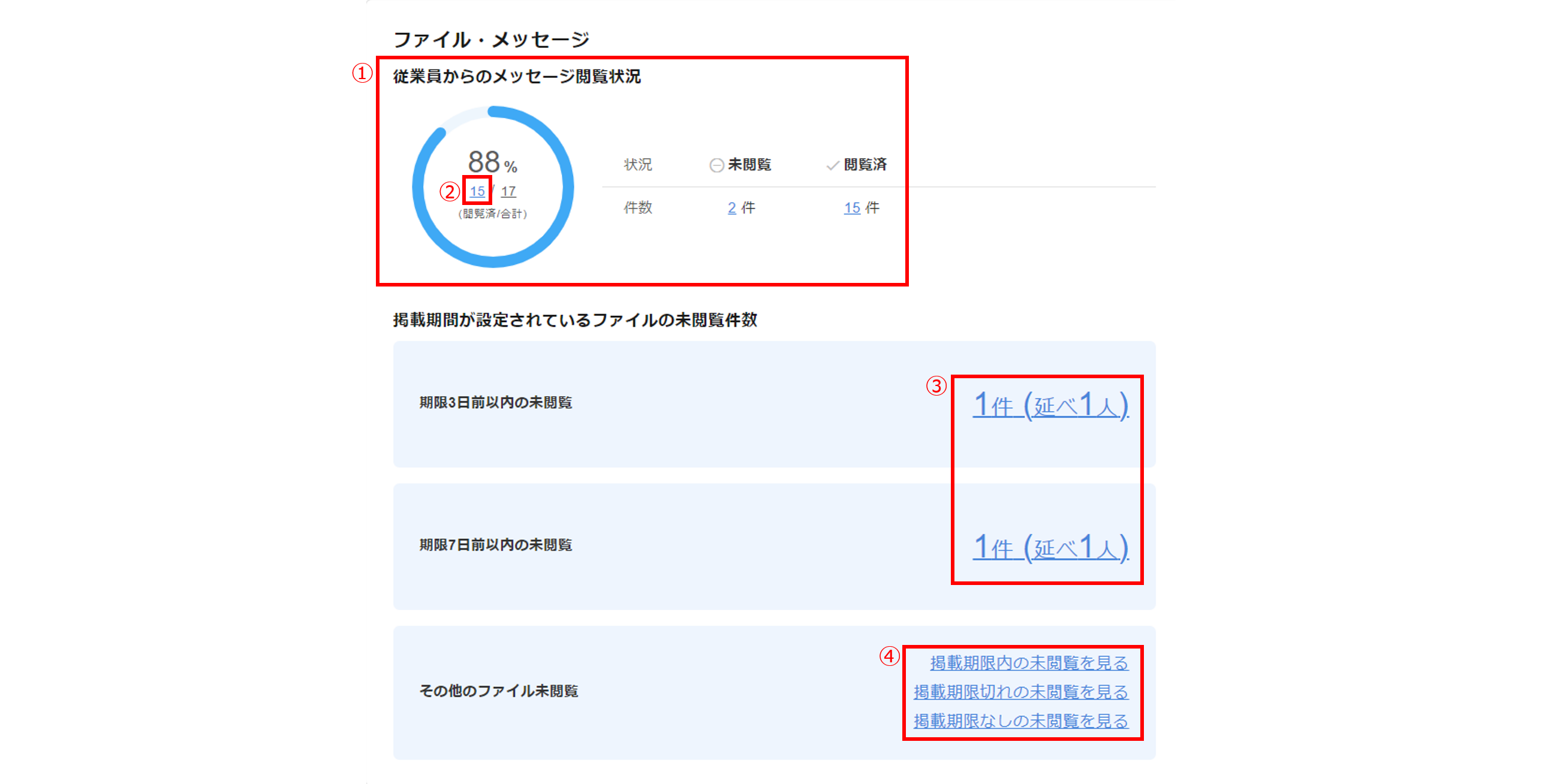 「掲載期間が設定されているファイルの未閲覧件数」の、「〇件 (延べ〇人)」()、「その他のファイル未閲覧」項目内の文言()をクリックすると、「ファイル/メッセージ送信」画面が表示され、該当のファイルを確認できます。