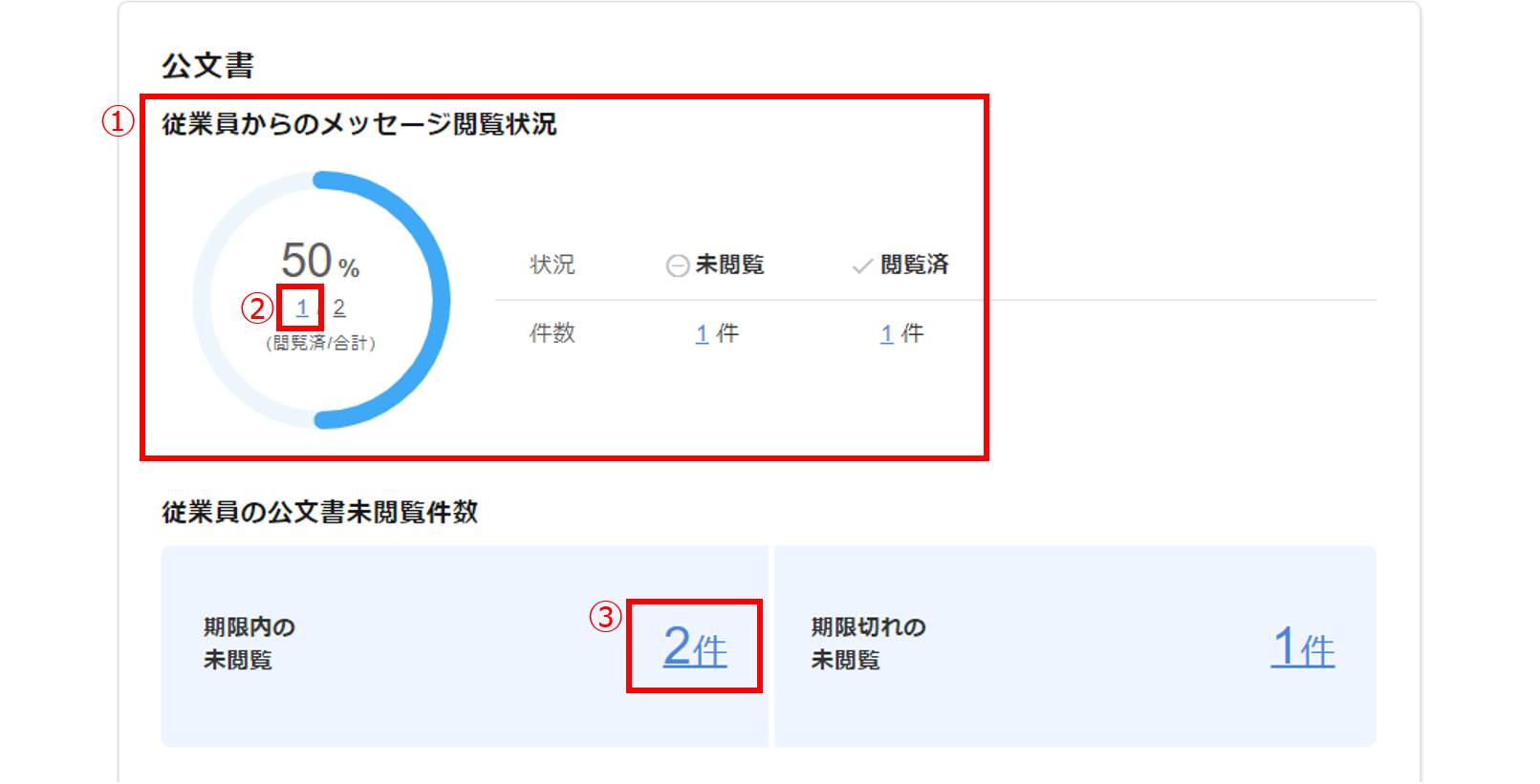従業員からのメッセージ閲覧状況()には、従業員から送信されたメッセージの、管理者側の閲覧状況が表示され、下線つきの数字()をクリックすると、「送信済公文書 一覧(従業員)」画面が表示され、従業員からのメッセージを確認できます。