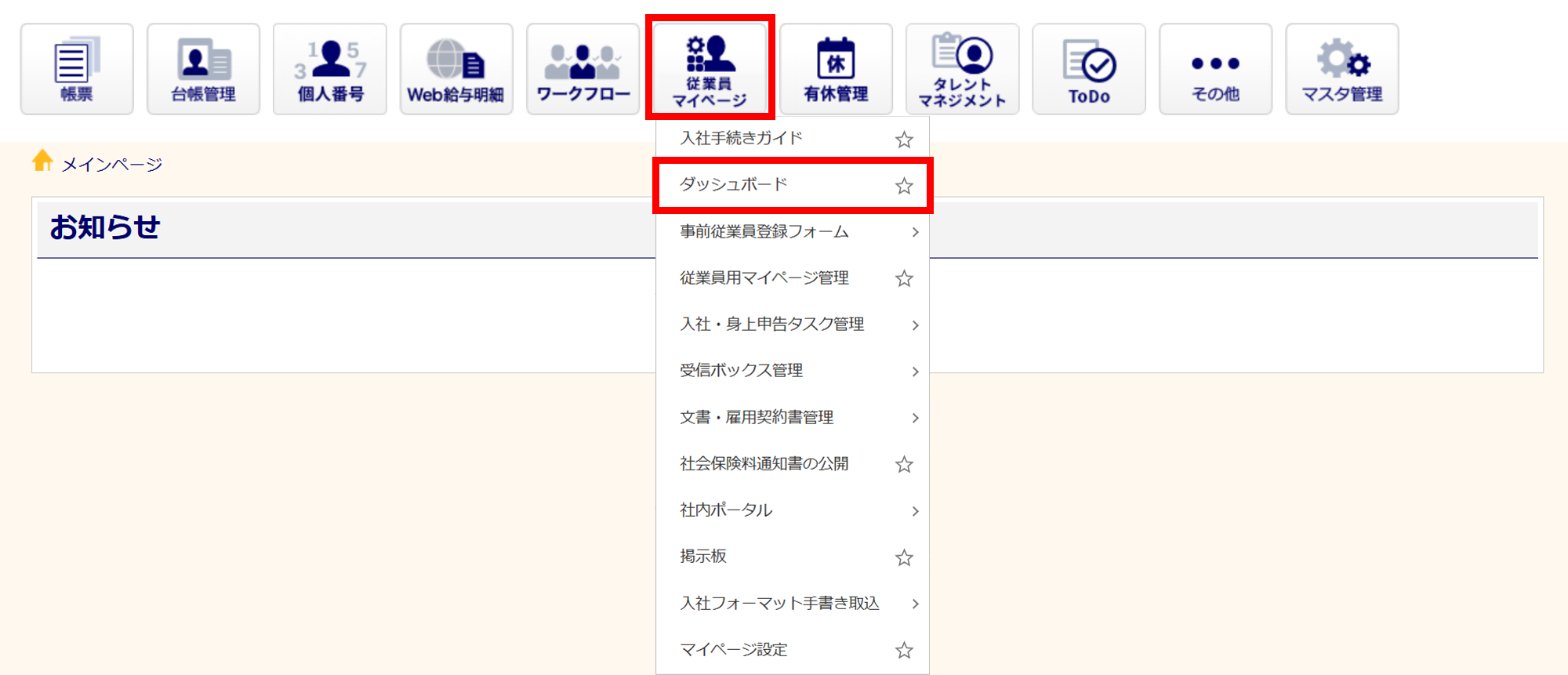 [従業員マイページ]>[ダッシュボード]をクリックします。