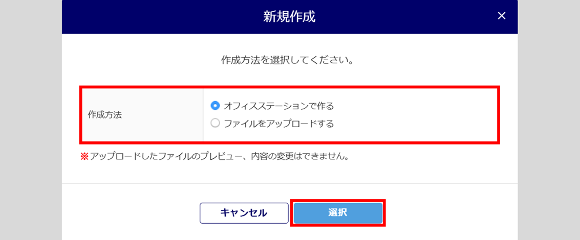既存の就業規則や規程の情報をファイルから引用する場合は、[ファイルをアップロードする]を選択し、[選択]をクリックします。
