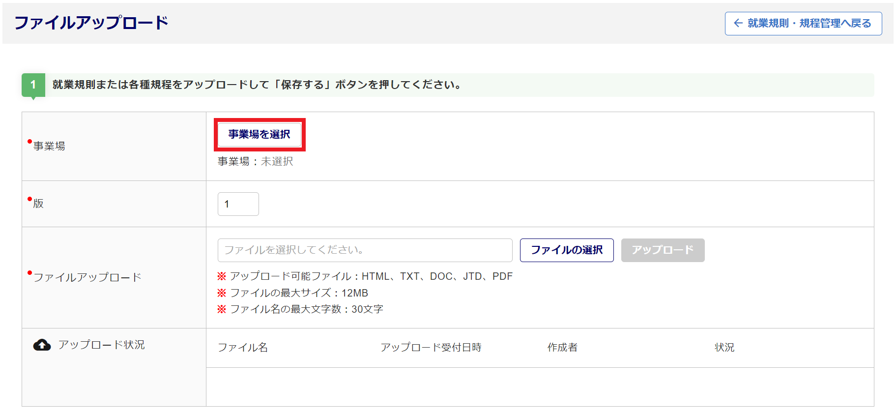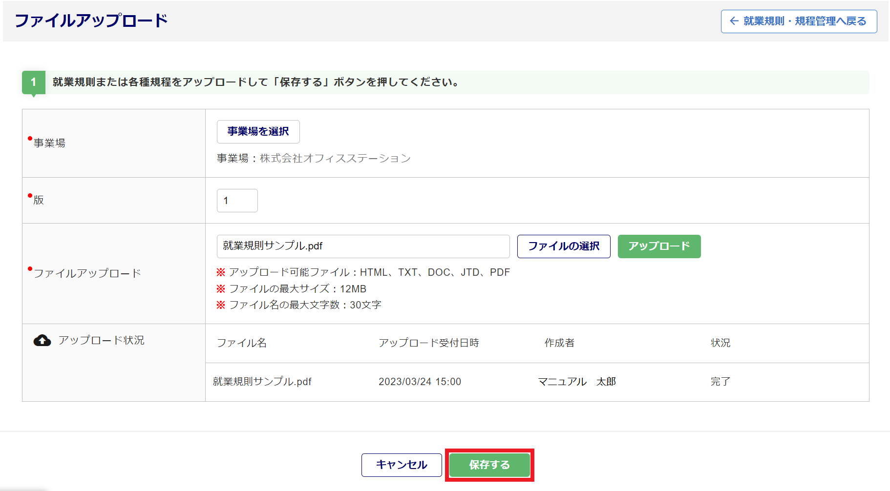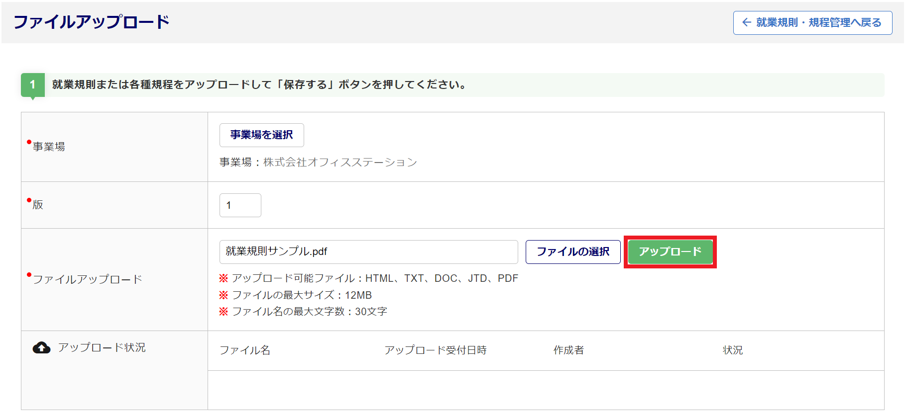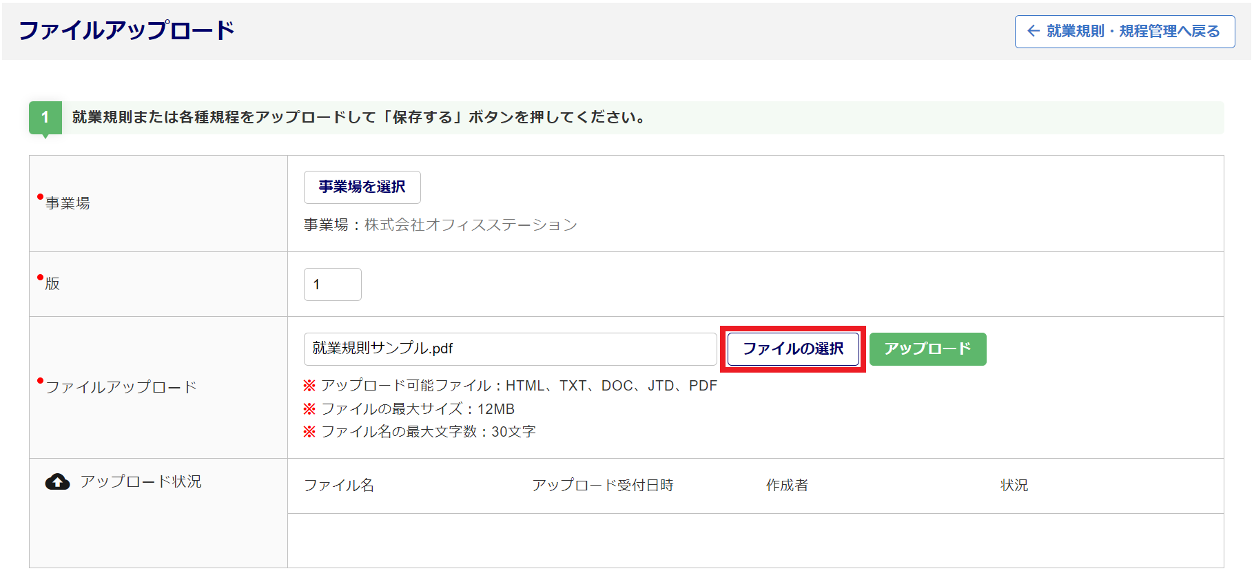 [ファイルの選択]をクリックし、就業規則や規程のファイルを選択します。
