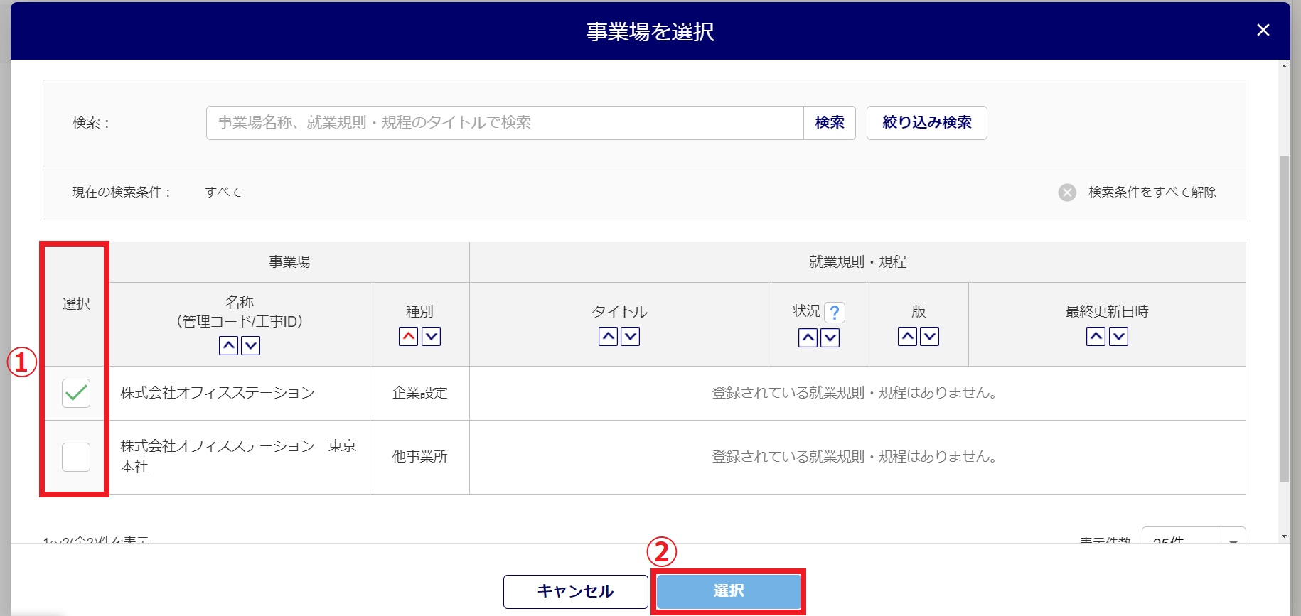 就業規則や規程を取り込む事業場の情報を「選択」列(①)にて選択し、[選択](➁)をクリックします。