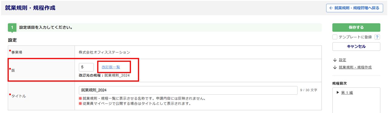 「版」には、現在の「版+1」の値が自動で反映されます。[改訂版一覧]をクリックすると、改訂版の一覧を確認できます。