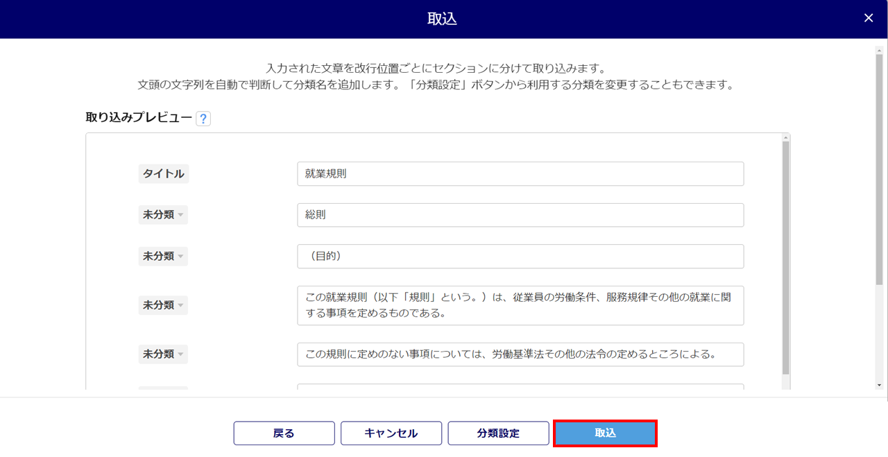 入力された文章を改行位置ごとにセクションに分けて取り込みます。文頭の文字列を自動で判断して分類名を設定します。