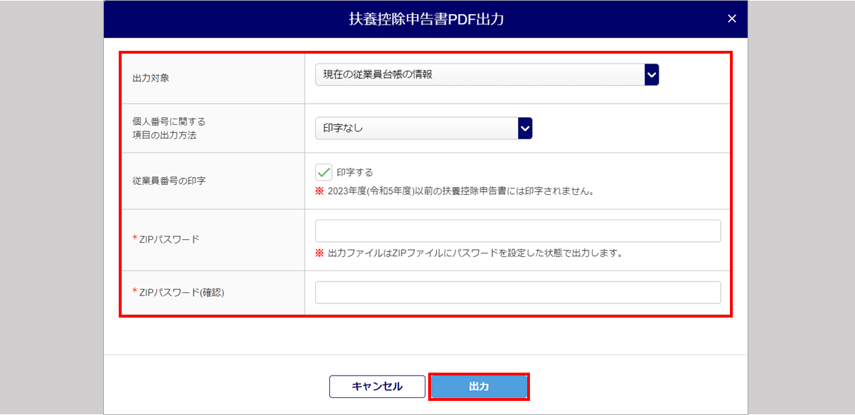 扶養控除申告書の出力には、以下の条件を満たす必要があります。