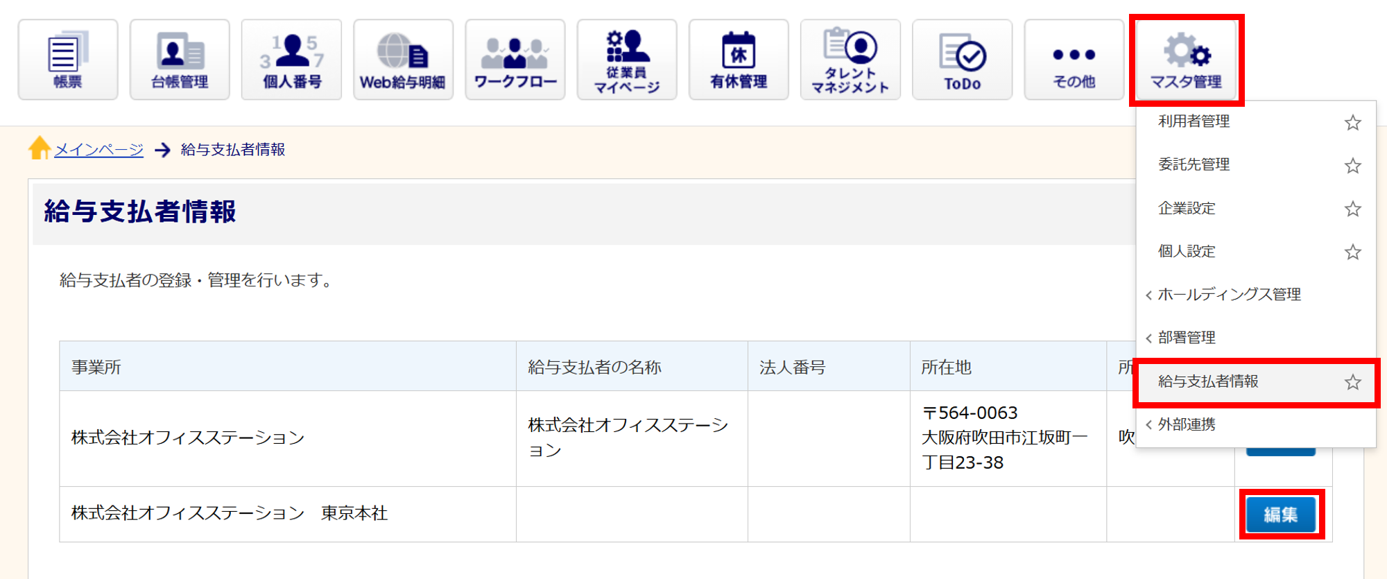 「給与支払者情報」の登録は、[マスタ管理]>[給与支払者情報]>[編集]からおこなえます。